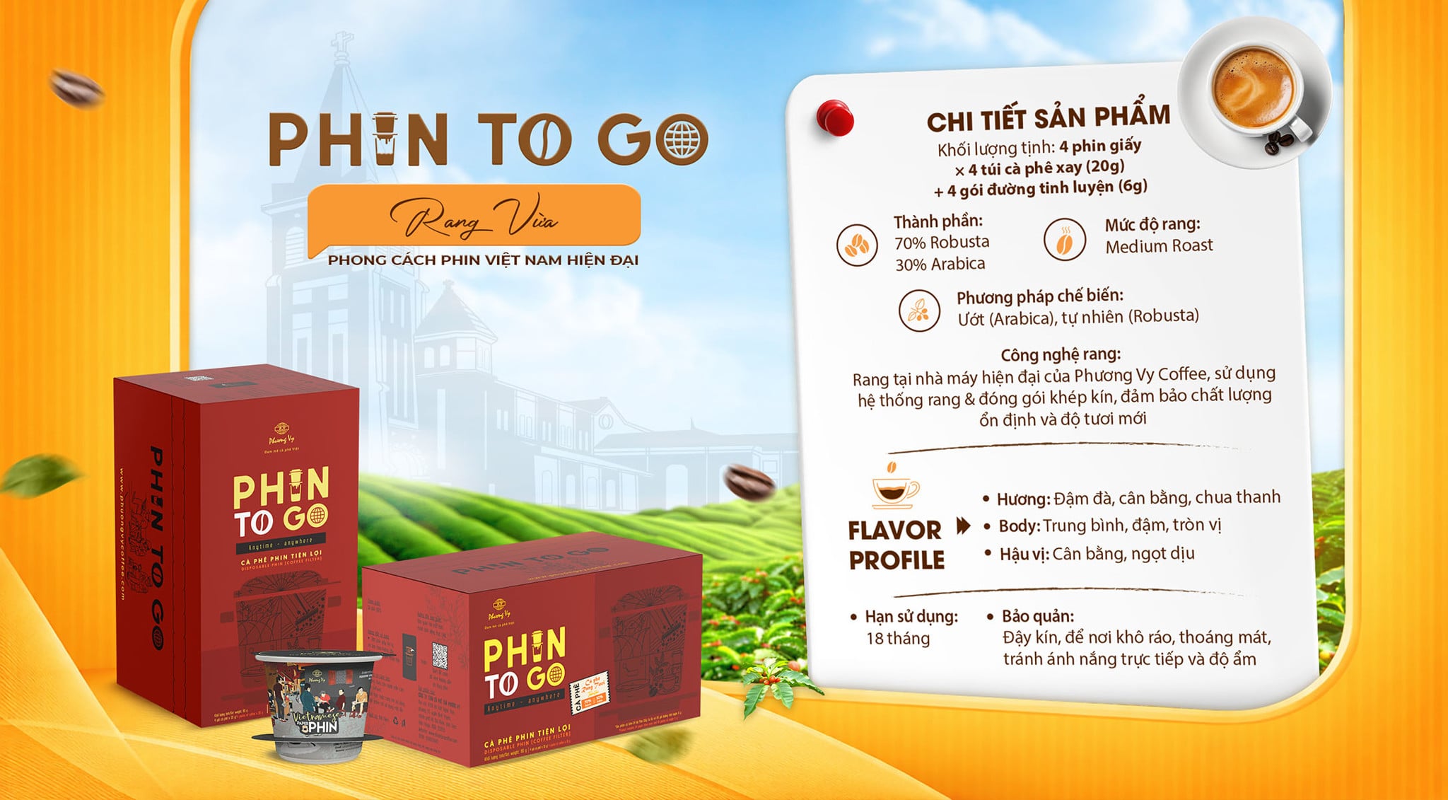 Cà phê Phin To Go tiện lợi và năng động, dành cho tất cả mọi người vẫn luôn yêu mến hương vị pha phin nhưng vẫn muốn tiết kiệm thời gian và dễ dàng mang theo bên cạnh trong những dịp du lịch, bận rộn nơi văn phòng.
